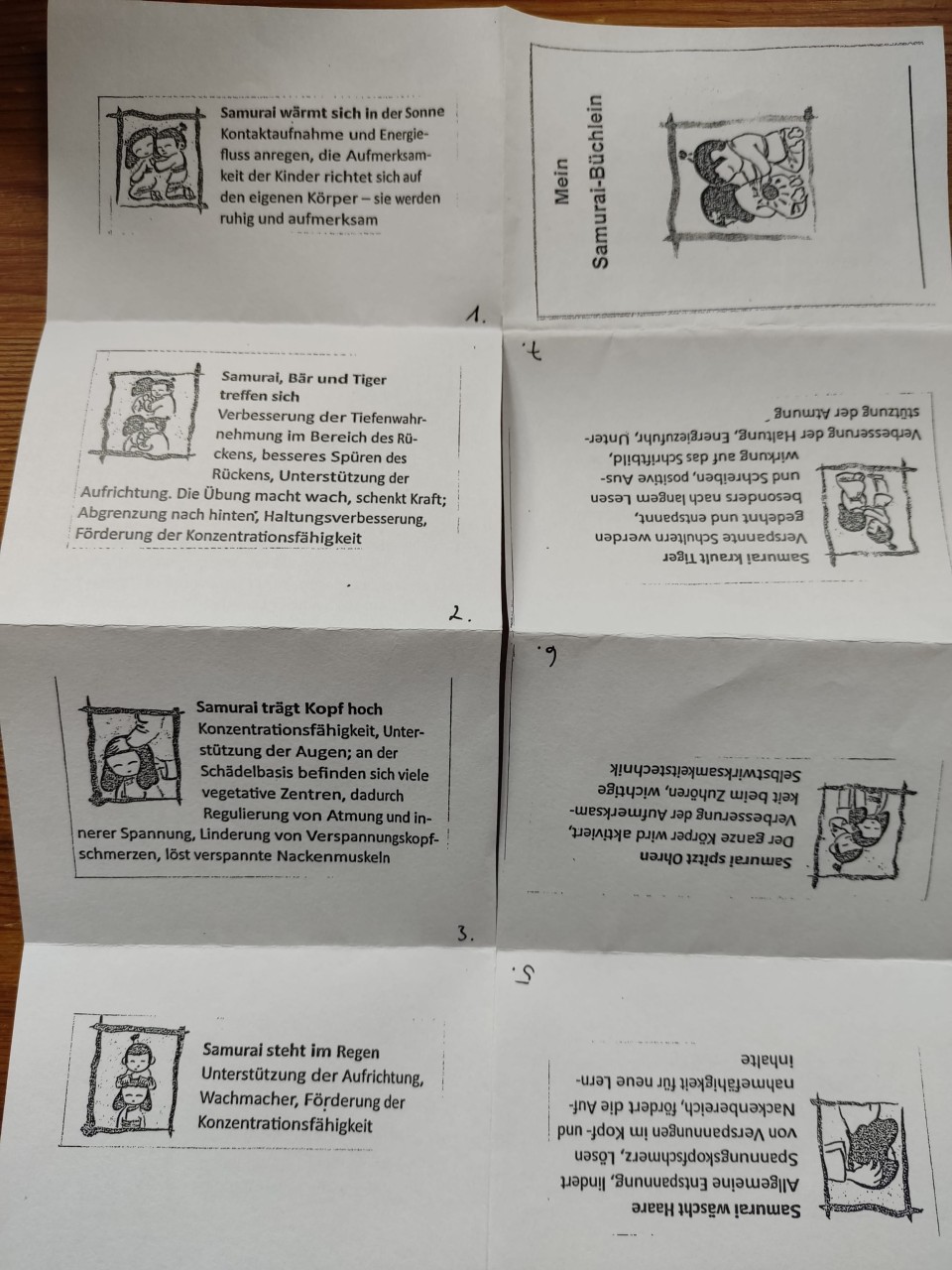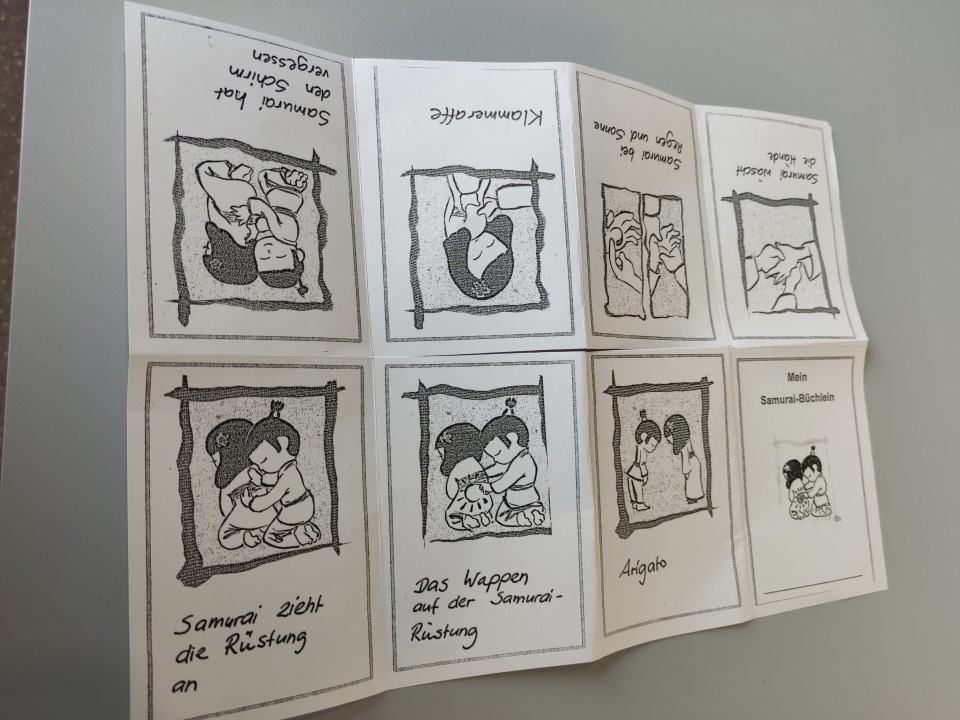 Die Eltern informierten wir in einem Brief und boten nach einigen Wochen einen Eltern-Kind- Workshop an. Aufgrund des großen Ansturms führten wir insgesamt fünf Veranstaltungen durch. Dabei verteilten wir sowohl für die Eltern als auch für die Kinder ein kleines Samurai-Büchlein, in dem die Übungen abgebildet waren. Aus dem Begleitheft Samurai-Programm. Fit für die Schule - stark fürs Leben bekamen die Eltern zu allen Übungen Erklärungen.